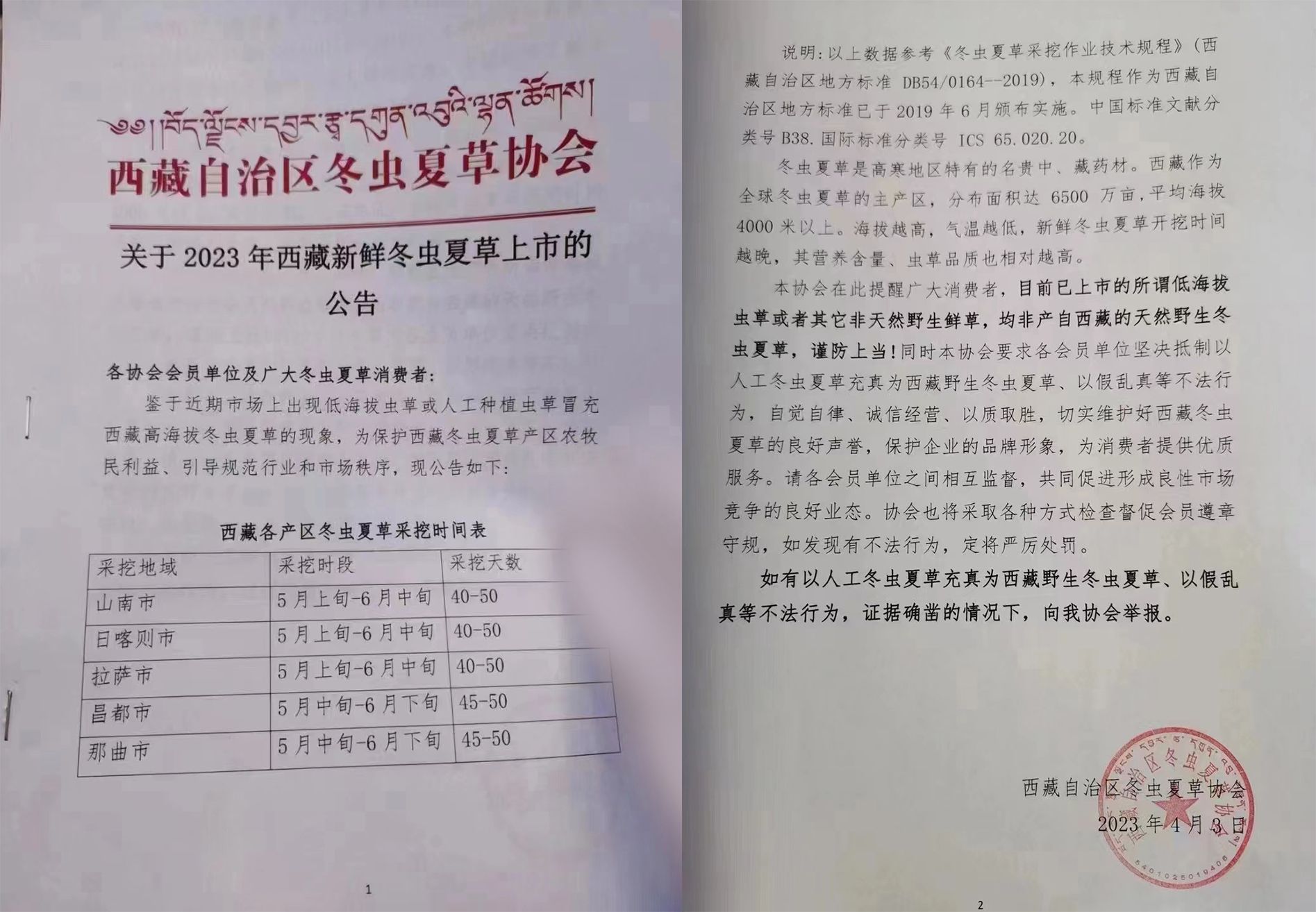 鑒于近期市場上出現低海拔蟲草或人工種植蟲草冒充西藏高海拔冬蟲夏草的現象,為保護西藏冬蟲夏草產區農牧民利益、引導規范行業和市場秩序,現公告如下: