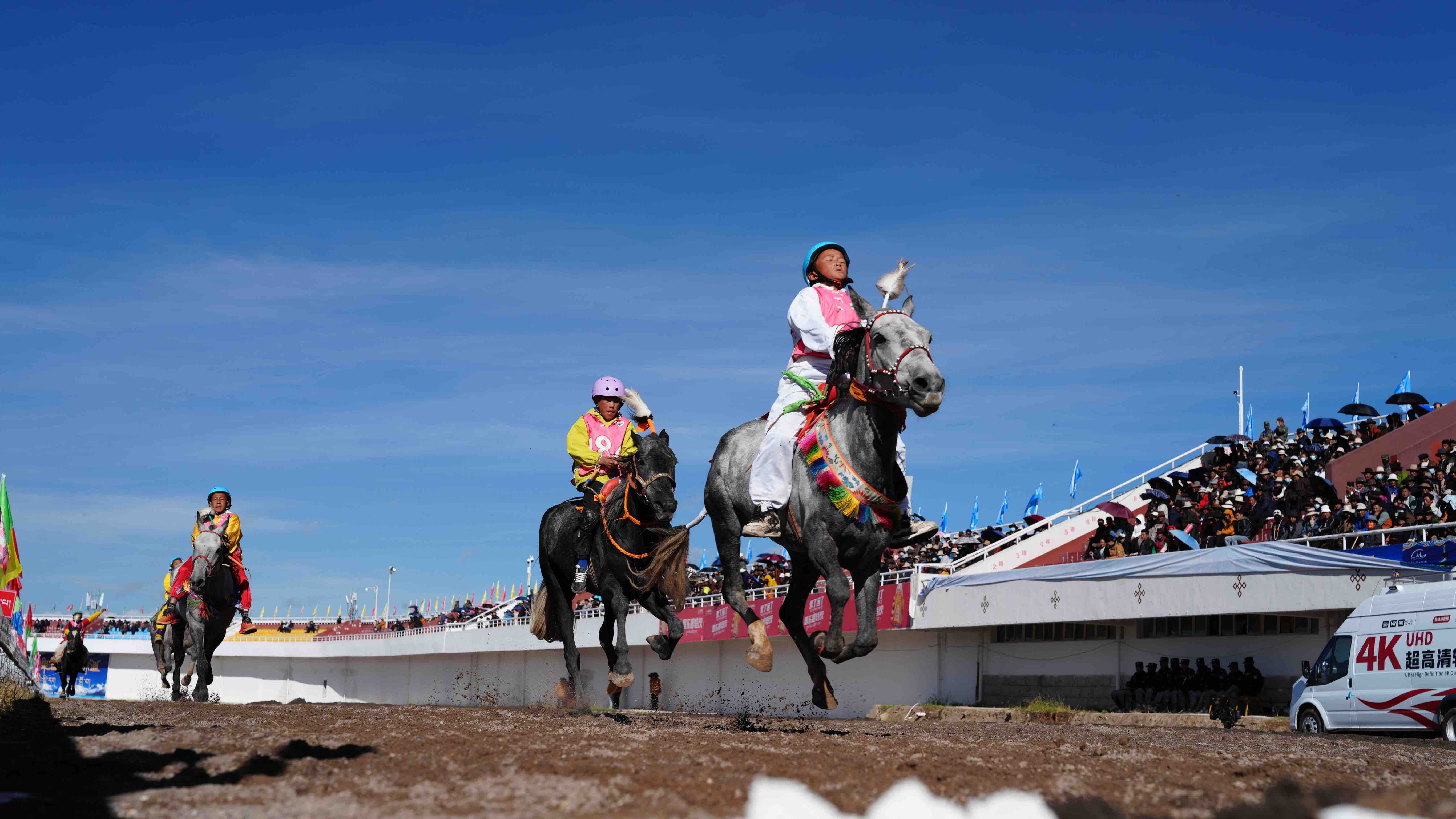 10:00,發令槍響驟然劃破草原的寧靜,場內速跑8000米(1.45米以上超馬)決賽正式拉開戰幕。來自比如縣夏曲鎮165號騎手與駿馬“玉珠色南”如一道銀色閃電疾馳而過,率先沖線。馬主貢嘎與旺青眼含熱淚望向仍在喘息的愛馬——這是他們三年來每日在海拔4000米以上高原堅持晨訓的成果。164號“玉珠雷電”與196號“玉馬”分列二三名,賽場上的每一次揮鞭、每一次沖刺,都是對高原騎手毅力與技藝的極大考驗。
